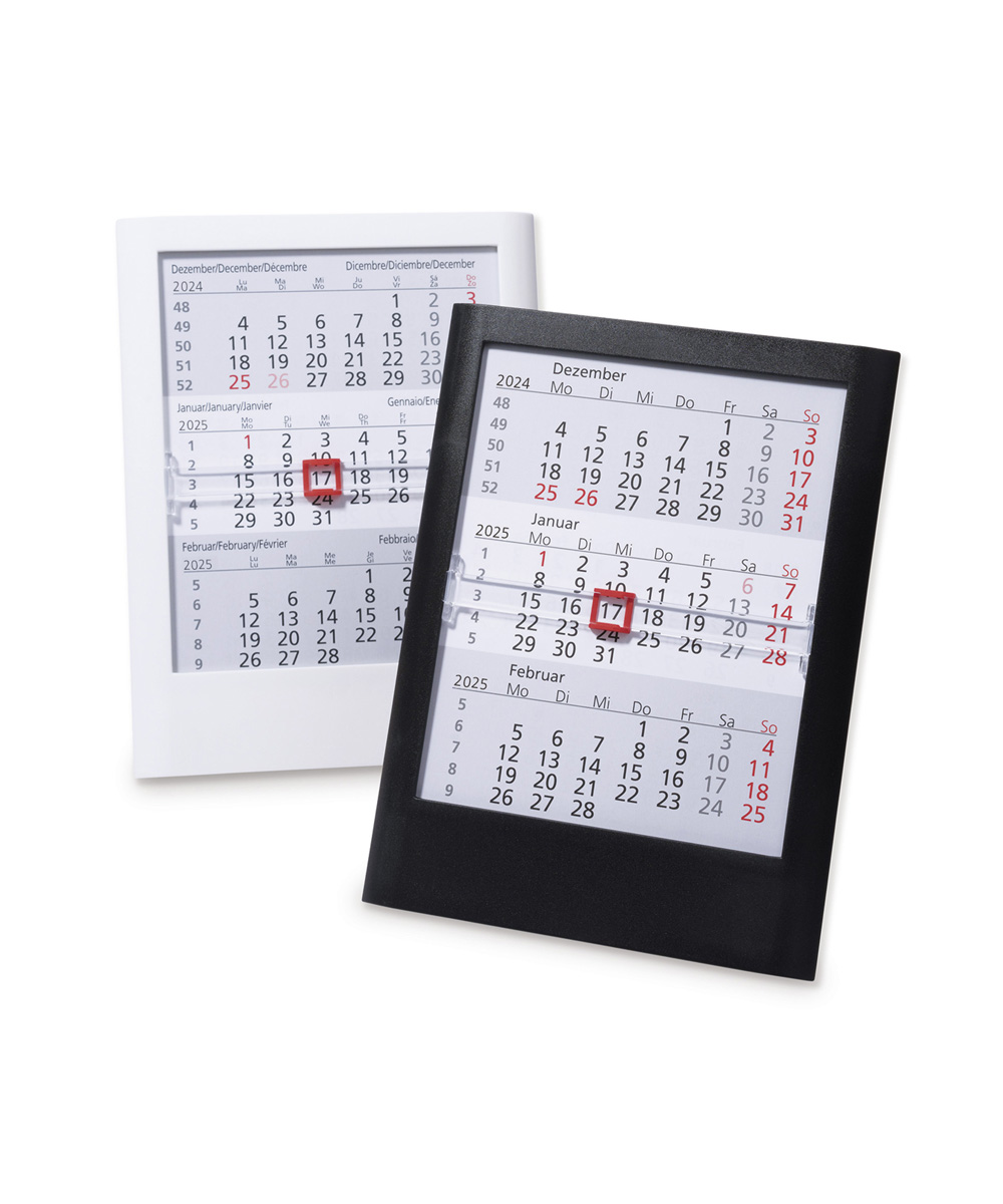 Πλαστικό ημερολόγιο γραφείου σε μαύρο ή λευκό χρώμα, με διετές ημερολόγιο σε 6 γλώσσες (D, GB, F, I, E, NL).